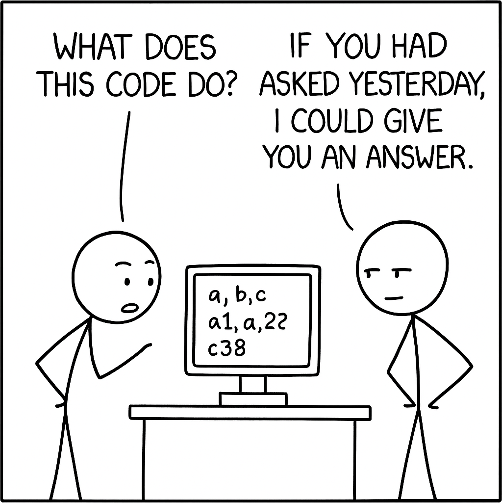 The first thing you might have notice is that function names and variable names are single letters with numbers, having no intuitive sign of what they are and why they are there, and you have to read the code to figure those out. This would be a disaster if the code were more lengthy and complicated than what was above. I have a quote criticizing those kind of code from the internet: “Today, only me and god knows what this piece of code does. Half years later, only god knows.”