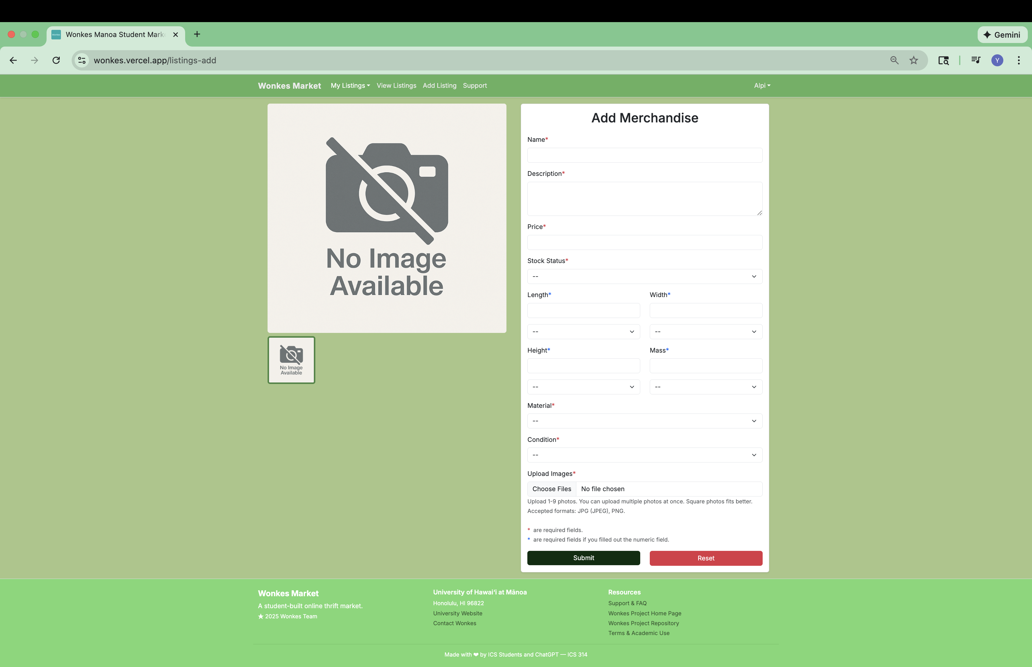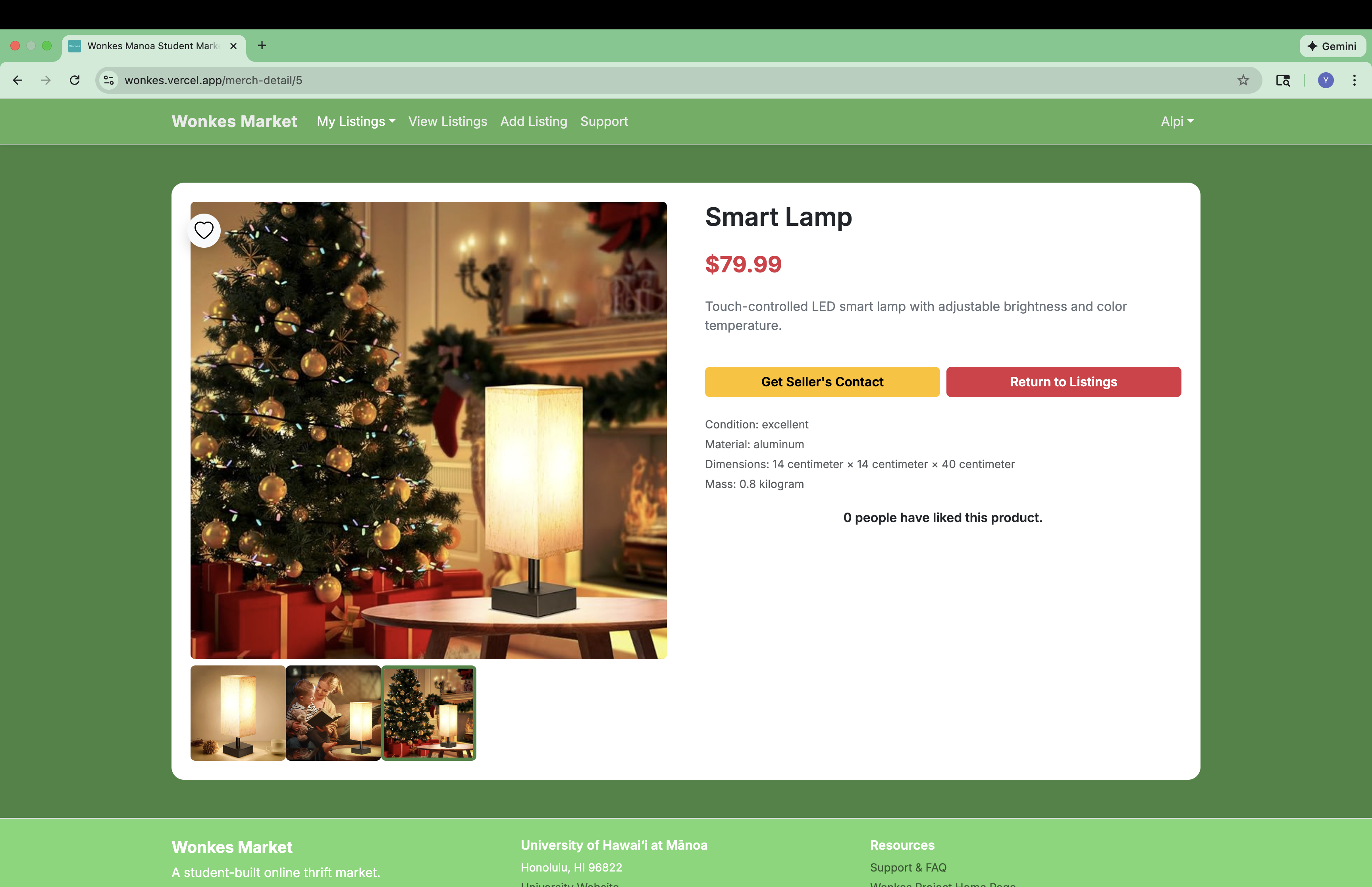 The page displays the details of a merchandise. I got inspiration on the UI design from Amazon and eBay. The photo preview is one component, and the details are another component. The photo preview component is reused in the add merchandise page: